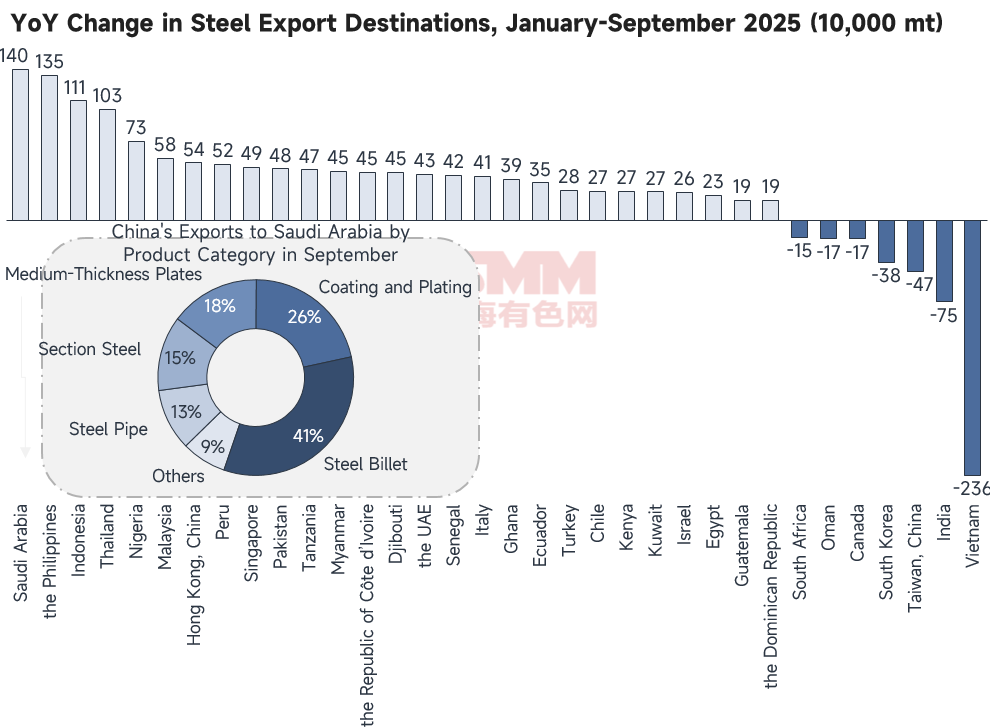 According to data compiled by SMM from the General Administration of Customs, China’s cumulative steel export volume from January to September 2025 reached 98.6964 million mt, up 17.14% YoY. Saudi Arabia remained the country with the largest cumulative YoY increase, up 1.4001 million mt, or 41.28% YoY. Specifically, among all steel product categories exported to Saudi Arabia in September, HRC’s share expanded again to 45%, accounting for nearly half of the total, followed by steel billet at 19%, while coated/galvanized and medium-thickness plates accounted for 12% and 8%, respectively. Compared with the export product distribution in August, some changes occurred: the shares of medium-thickness plates and coated/galvanized products declined, while the proportions of steel billet and HRC increased again.