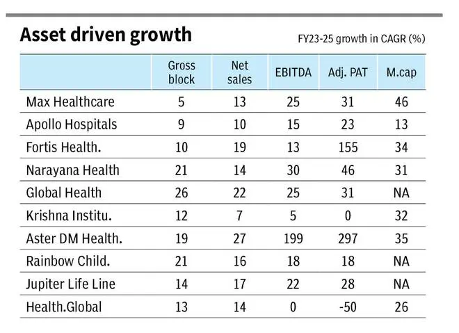 The Indian hospital sector is looking to nearly double its existing capacity in the next five years. As shown in the table, the top-10 players are adding close to 24,000 beds in the next five years, which is a 65 per cent addition to their current capacity of 37,000 beds. On optimistic assumptions, this implies a volume CAGR of 10-11 per cent for the next five years, in addition to 6-7 per cent ARPOB growth for the industry. The players have delivered an average 16 per cent revenue CAGR in FY23-25  and appear to be gearing up to deliver a similar performance in the next five.