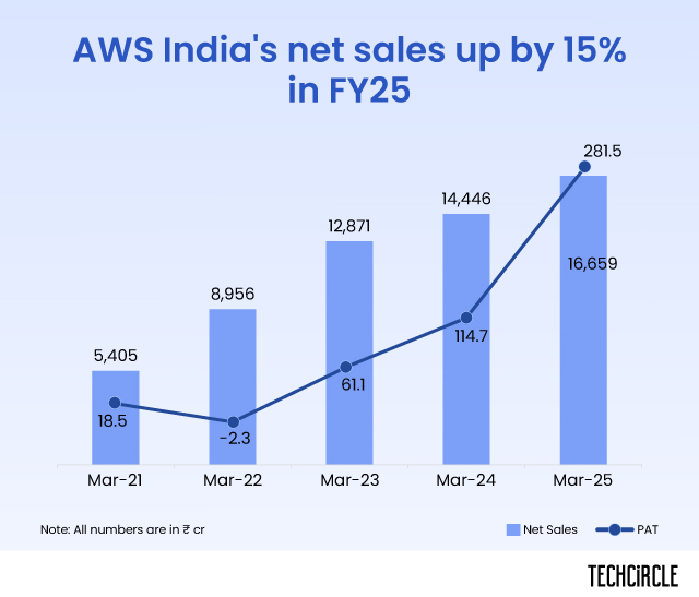 Amazon Web Services (AWS) India, which started its operations in 2016 as Amazon Internet Services, recorded net sales of ₹16,659 crore (`$2 billion) in FY25. It is up by 15% from the previous year’s figure of ₹14,446 crore.