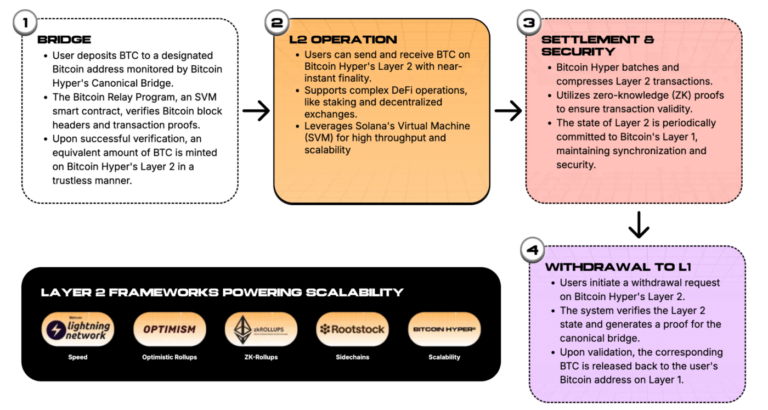 It will periodically report its state back to the Bitcoin L1 using ZK-rollups, ensuring that Bitcoin Hyper’s L2 transactions maintain the same level of immutability and neutrality as those on the base layer. This setup opens the door for a wide range of applications – from DeFi to meme coins – which will be able to settle on Bitcoin without compromising security.
