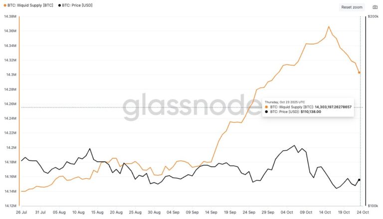 In an X post on October 25, Glassnode reports that Bitcoin’s illiquid supply has fallen by 62,000 BTC since mid-October. For context, Illiquid Bitcoin refers to BTC that is held in wallets with little to no history of selling. They are essentially coins that are unlikely to move because their holders rarely spend and are considered off the market.