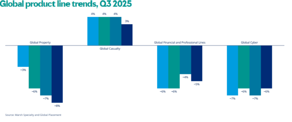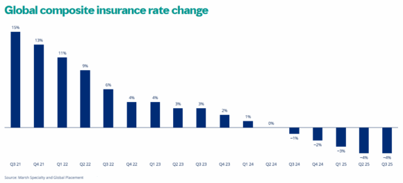 Global commercial insurance rates fell, on average, by 4% in the third quarter of 2025, repeating the 4% decline recorded in Q2 2025, according to the latest Global Insurance Market Index published by Marsh, the insurance brokerage business of Marsh McLennan.