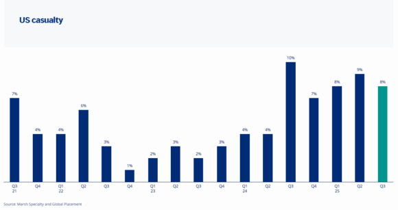 - Casualty rates increased 3% globally – down from 4% in Q2 2025 – which was driven by an 8% increase in the US due largely to the frequency and severity of casualty claims, many of which are characterized by large (so-called “nuclear”) jury awards.