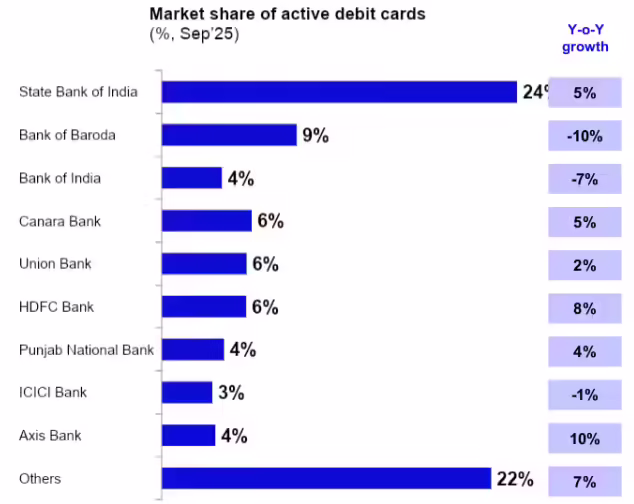 Source: 1latticeOther top banks in debit cards included Bank of Baroda with a 9 per cent market share, followed by Canara Bank, Union Bank of India, and HDFC Bank, each with about 6 per cent, and Bank of India, Axis Bank, and Punjab National Bank at 4 per cent.