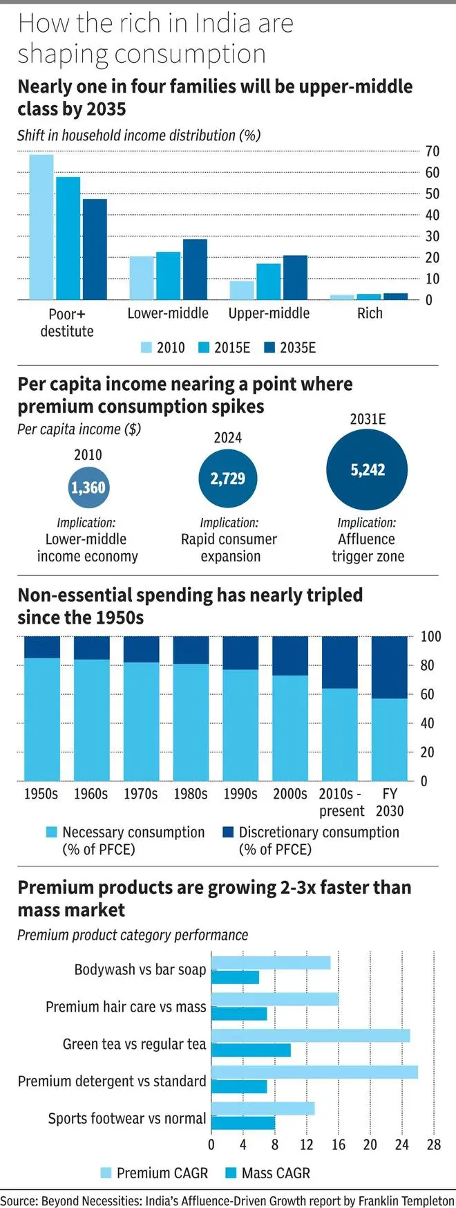 India’s income pyramid is undergoing a major shift. The share of upper-middle and rich households is projected to rise from 11.1 per cent in 2010 to nearly 24 per cent in 2035, implying that about one in four Indian households will have high discretionary spending capacity.
