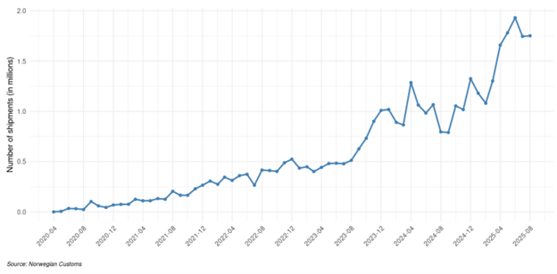 Five years after the introduction of the VOEC scheme, it is now well known and has been integrated for relevant actors in the logistics chain, while the scope of its use is increasing significantly, especially since the fall of 2023. Today, the number of monthly VOEC shipments is around 1,75 million. This means approximately 80 percent of the total number of shipments with a value beneath 3 000 NOK to private recipients are benefitting from the VOEC scheme.
