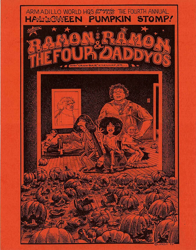 The stomps started at the Armadillo in 1970, though Franklin had played with pumpkin imagery at the Vulcan and in Houston. They ran for much of the ‘Dillo’s life, with additional manifestations at the Steamboat and the Ritz Theater on Sixth Street, where they transformed Halloween celebrations in Austin’s party district. Ramon typically accompanied the pumpkin massacre, but other artists like Asleep at the Wheel stepped in now and again. One writer described the ’74 stomp thusly: “Franklin . . . in his legendary armadillo bonnet, hushed the crowd, fixed his goggles, and held a small pumpkin in the air. ‘Then he began the mystical chant, Peter, Peter, pumpkin eater,’” dropped the pumpkin, and dancers stomped it into the ground.